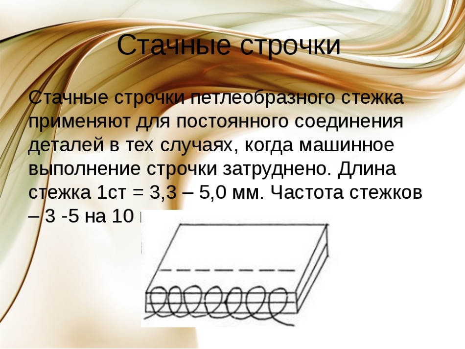Стачную ручну сходинку використовують тоді, коли зробити машинну неможливо. Як бачите, на фото нижче є стачные рядки петлеобразное виду, з їх допомогою зручно зшивати тканини, наприклад на рукавах і поличці, якщо машинний шов розійшовся. Щоб вийшло красиво і потім шов не виділявся на виробі, робіть стежки невеликого розміру, приблизно 3-5 міліметрів і не залишайте між ними великі проміжки.