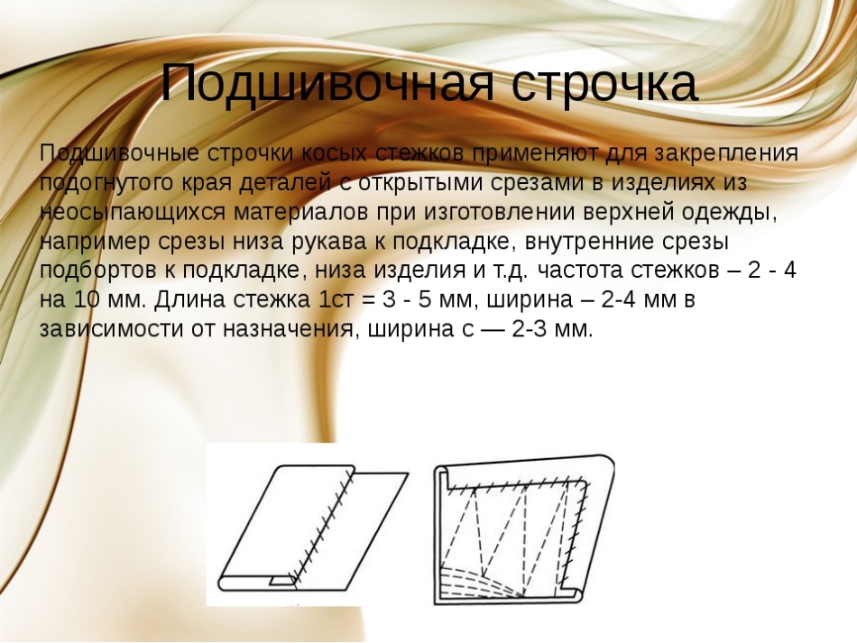 Підшивальні швом обробляютьподгибки низу, кишені і т. д. Він хороший тим, що майже непомітний на лицьовій стороні. Виконують його за схемою наданою нижче. Якщо точніше, то підвернуту тканина проколюють голкою з ниткою, а вище загину захоплюють лише невелику ділянку тканини, так щоб нитка не видно було на лицьовій стороні виробу. І так виконують стібок за стібком, розміри стібків краще робити невеликими, тоді виріб буде виглядати акуратно після пошиття.