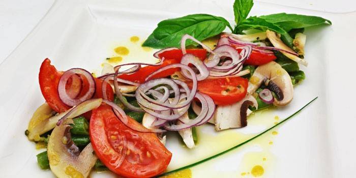 Виконувати роль гарнір до основного блюда може простий, але смачний салат зі смаженими печерицями. Хоча він підійде і для самостійного дієтичного перекусу. Крім того, такий салат з печериць відноситься до вегетаріанським, адже не включає м’ясні продукти. Замість них використовуються овочі – кабачки, перець і баклажани. Хоча з грибами добре поєднується і біла квасоля, свіжа або консервована. Все залежить від вашого бажання експериментувати з продуктами.