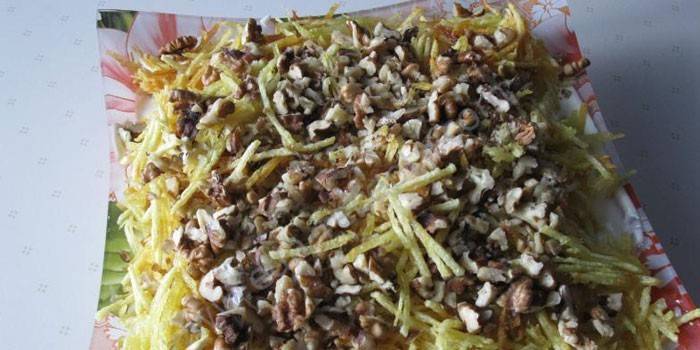 5. Взяти салатницю, куди викласти всі продукти шарами – половина сиру, яєць і картоплі, потім майонез і частину горішків.