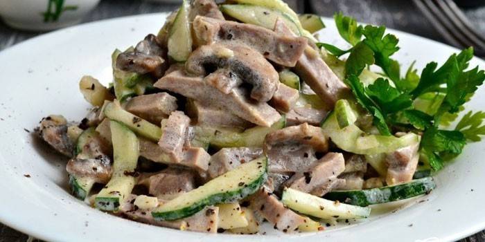Для любителів більш ситні м’ясні страви підійде рецепт салату з мовою і печерицями. Складність його приготування полягає тільки в відварюванні субпродукту, але в цей час можна нашаткувати інші компоненти. Потім залишиться тільки все змішати і заправити. Таке блюдо буде відмінно доповнювати навіть святковий стіл, тому ви сміливо можете подати його гостям.