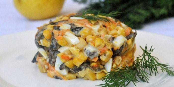 Інше цікаве і більш яскраве страва — салат з печерицями і кукурудзою. На багатому святковому столі він буде виглядати не гірше інших страв. Ситним це блюдо робить знову ж курочка. Вона так добре поєднується з печерицями, що використовується в багатьох рецептах з цими грибами. Яскравий зовнішній вигляд салату надають такі різні за кольором кукурудза і морква.