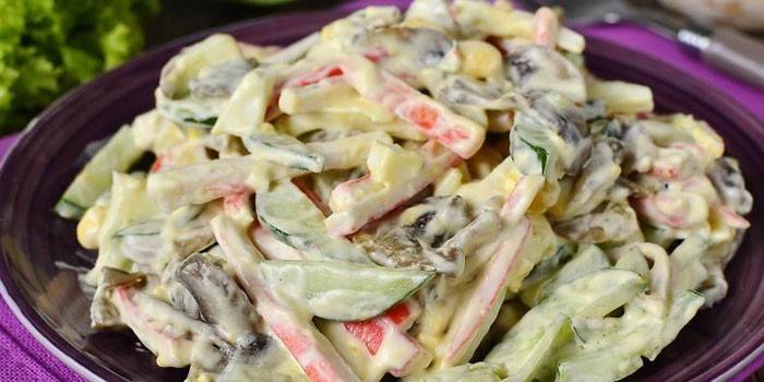По цьому рецепту ви зможете приготувати швидкий салат з крабовими паличками і печерицями. Він є стравою із серії «на швидку руку». Тут не тільки інгредієнти дуже прості, але і сама технології приготування. Все подрібнити, змішати, і салат готовий. Навіть за такої легкості закуска має надзвичайно ніжний і м’який смак. Хочете побалувати себе? Тоді приготуйте такий салатик.