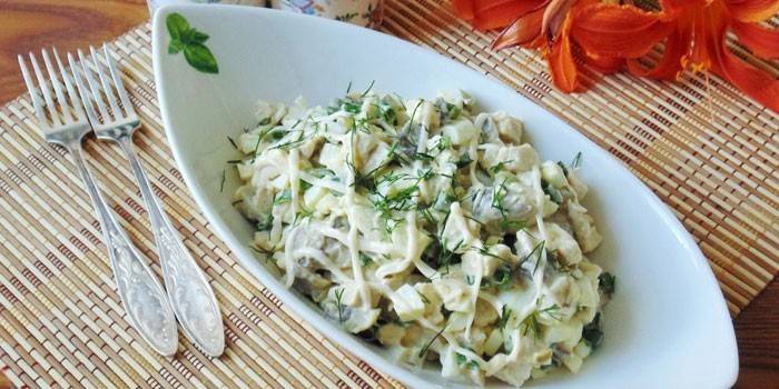 За смаком і популярності одним з перших можна вважати салат курячий з печерицями. М’ясо краще використовувати у вигляді філе або грудки. Хоча стегна теж підійдуть, але тоді страва вийде більш калорійним. Салати з свіжих печериць і курочки можуть стати відмінною альтернативою вже доволі набридлому «Олів’є». Новорічний стіл від цього тільки виграє. Якщо ви хочете поповнити список своїх улюблених рецептів, то обов’язково спробуйте описаний нижче.