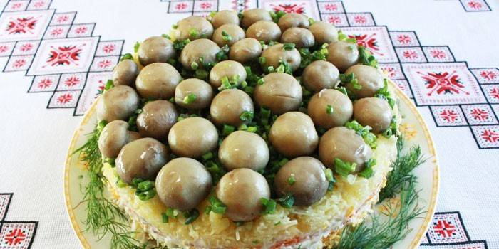 Якщо ви шукаєте рецепт не тільки апетитного, але ще красиво оформленого страви, то спробуйте приготувати салат Полянка з печерицями. Продукти в ньому використовуються найпростіші, а акцент робиться на подачі, тому потрібні грибочки з цільними капелюшками. Завдяки технології приготування такої страви є ще одна цікава назва – «Переверт». Про неї ви дізнаєтесь нижче. У результаті виходить салат з консервованих печериць, який навіть виглядає смачно.