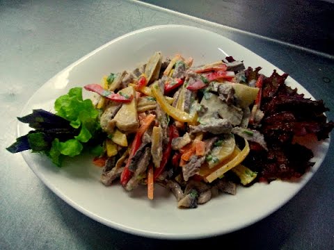 Для любителів більш ситні м’ясні страви підійде рецепт салату з мовою і печерицями. Складність його приготування полягає тільки в відварюванні субпродукту, але в цей час можна нашаткувати інші компоненти. Потім залишиться тільки все змішати і заправити. Таке блюдо буде відмінно доповнювати навіть святковий стіл, тому ви сміливо можете подати його гостям.