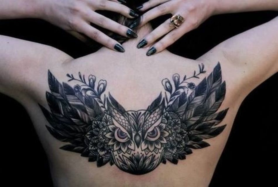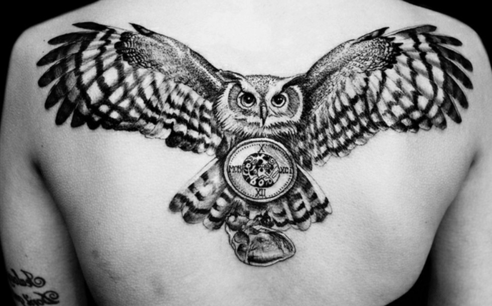 • Тату сова або пугач на спині – це неймовірно красивий малюнок, особливо якщо птах з розкритими крилами, це говорить про свободу людини і силі духу, і підкреслює наявність невидимих крил у власника татуювання.