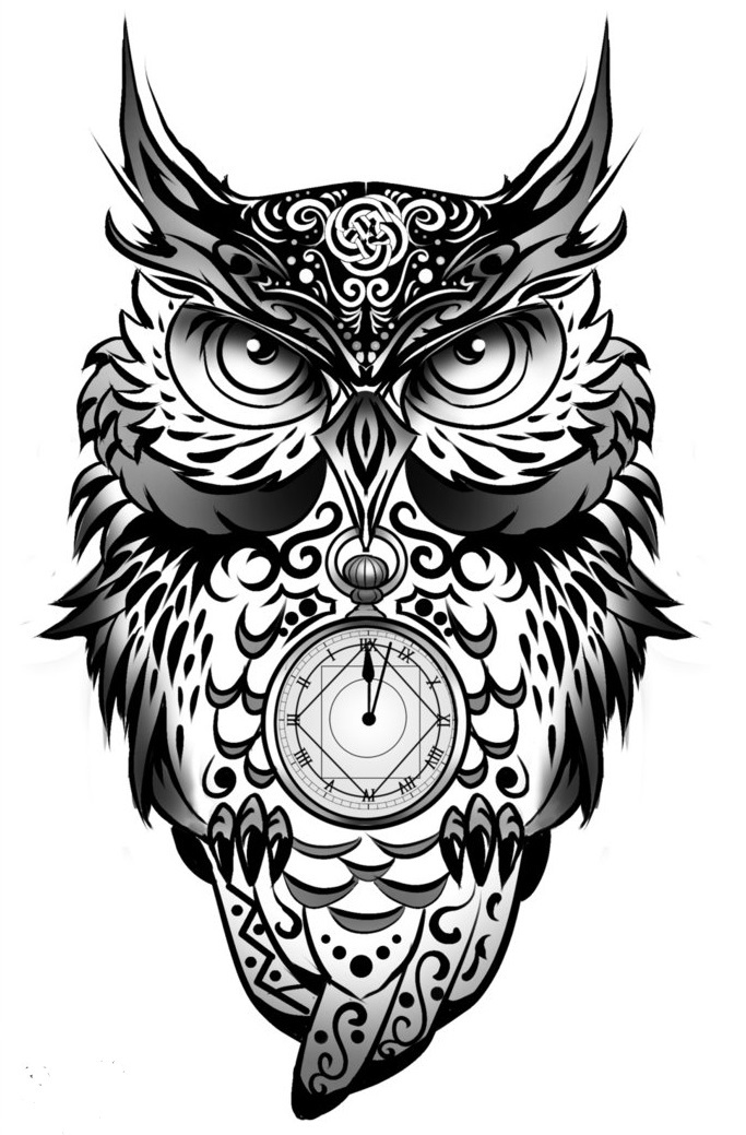 • Сова, пугач з годинником – це значимість швидкоплинності часу, власник вказує на цінність життя, і бажання використовувати кожну хвилину з розумом.