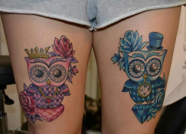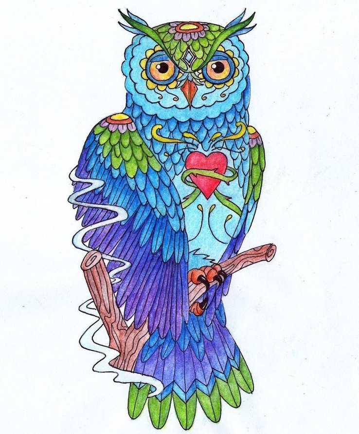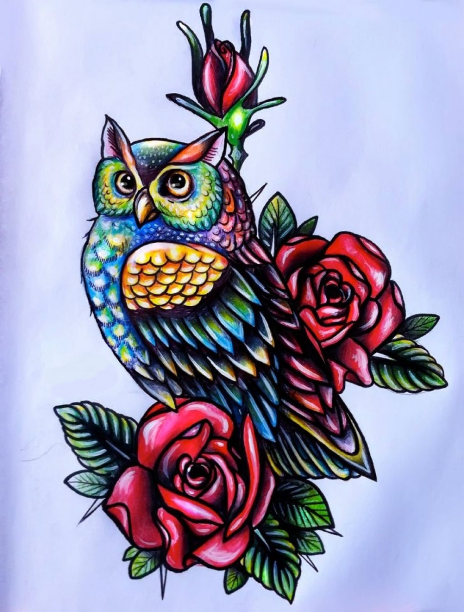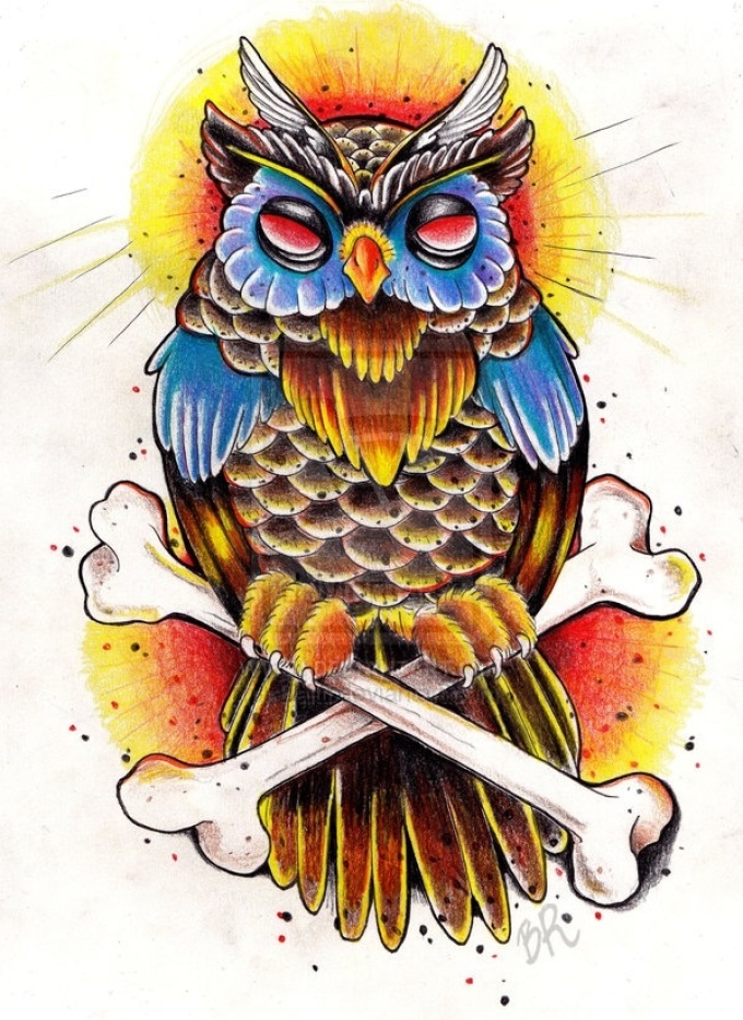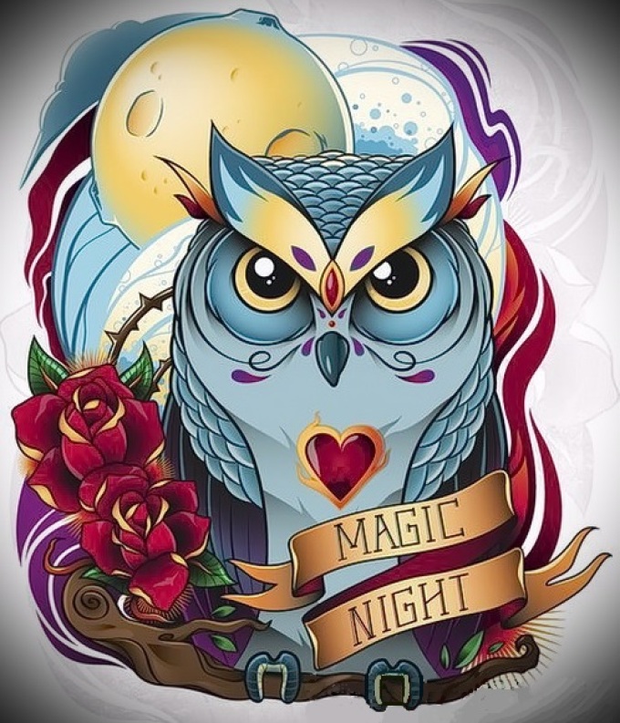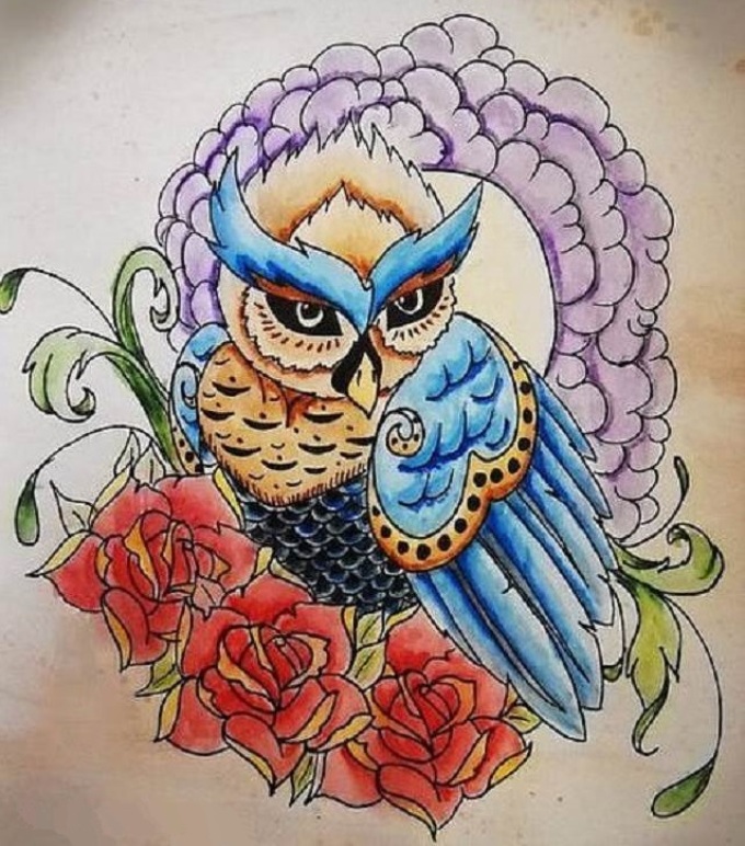 • Дівчина відкрита для спілкування і нових знайомств якщо на тілі зображена сова в яскравих фарбах.