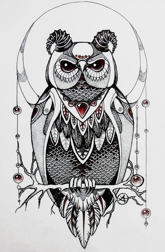 • Сова, пугач з місяцем – символ таємничості і підкреслює гарну інтуїцію власника малюнка.