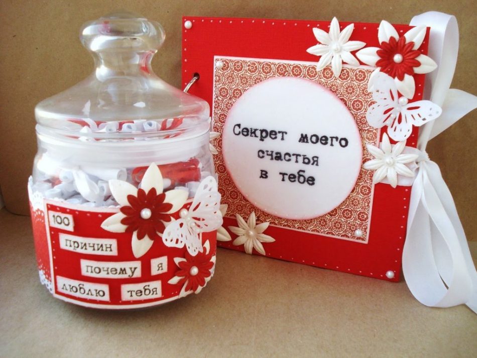 5. Банку з зізнаннями чи 100 причин, чому ви любите вашого хлопця. Один з найбільш оригінальних і милих подарунків. Зробити таке дуже легко. Потрібно взяти баночку з кришкою або яку-небудь гарну коробку, потім нарізати папір однакового розміру і написати на ній причини. Потім скрутити в трубочку або зігнути кілька разів, пересипати в обрану ємність. Подарунок готовий.