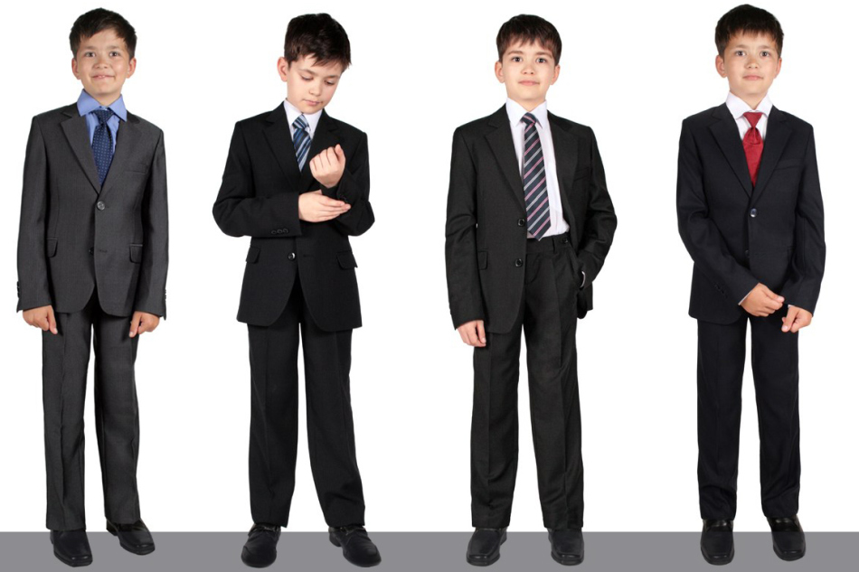 - Для хлопчика-першокласника підібрати шкільну форму набагато простіше. У будь-якому випадку необхідно придбати костюм, краще з 2-ма парами штанів, сорочки з натуральних тканин світлих тонів – підійде блакитний, світло-бежевий, кремовий і білу сорочку для святкових заходів