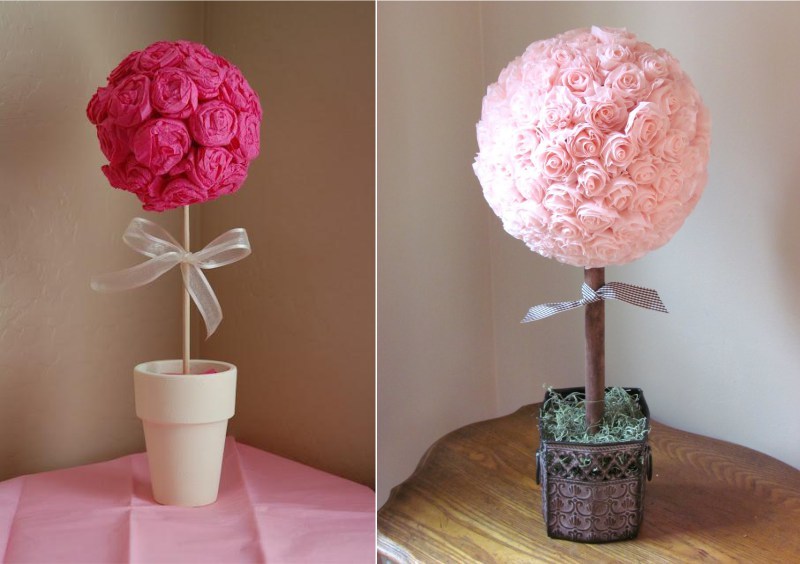• Цю саморобку буде зробити важче. Топіарі сам по собі дуже маленький і схожий на невелике дерево. Для створення вам буде потрібно папір крепований, основа, клей і нитки.