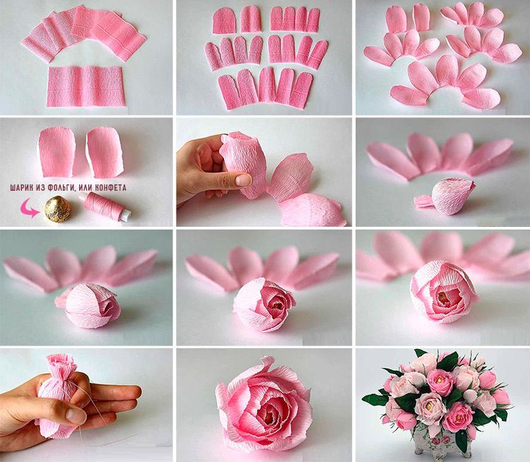 Створити красиві квіти з крепу нескладно. Є багато різних варіантів створення як окремих бутонів, так і цілих букетів.