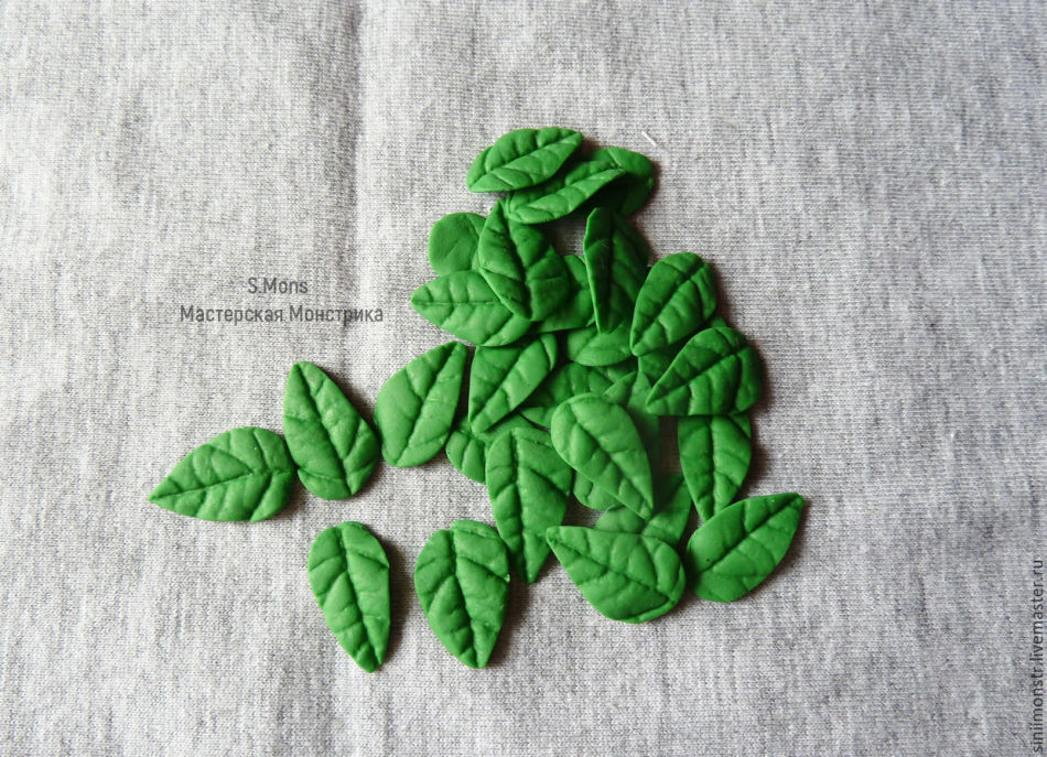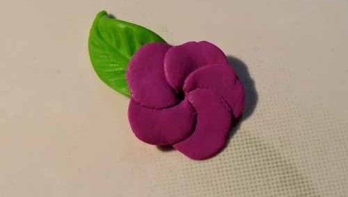 Наприклад, спробуйте зробити листочок з квіткою. Для листочка спочатку зліпіть овал і притисніть його. На одній стороні вылепите гострий краєчок, а з іншого залиште як є. Зубочисткою видавіть прожилки на листочку: