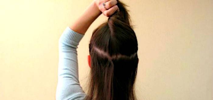 - Добре розчешіть волосся, щоб пальці вільно проходили між пасом, потім зберіть їх у хвостик на потилиці, але не фіксуйте. Прослідкуйте, щоб на голові не залишилося «півнів», інакше зачіска буде виглядати не дуже акуратно. Пригладьте волосся.