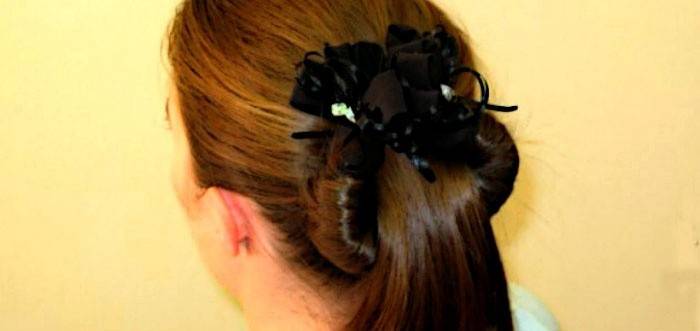 - Коли ви упретеся ребром шпильки в основу хвоста, потрібно правильно її закріпити. Відрегулюйте висоту зачіски, переміщаючи масив волосся вгору або вниз по потиличній частині. Закрутіть кінці твістера у формі пучка або «рогалики», щільно фіксуючи пасма. Зачіска готова!