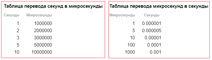 Щоб вам було легше переводити секунди в мікросекунди і навпаки, ми пропонуємо такі невеликі таблиці для найпопулярніших дій.