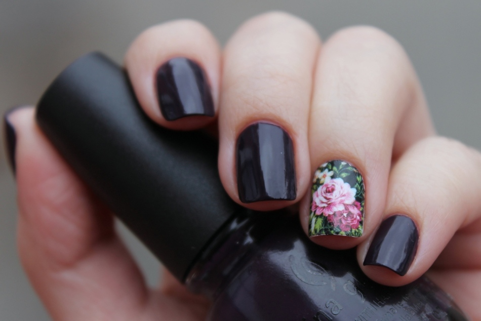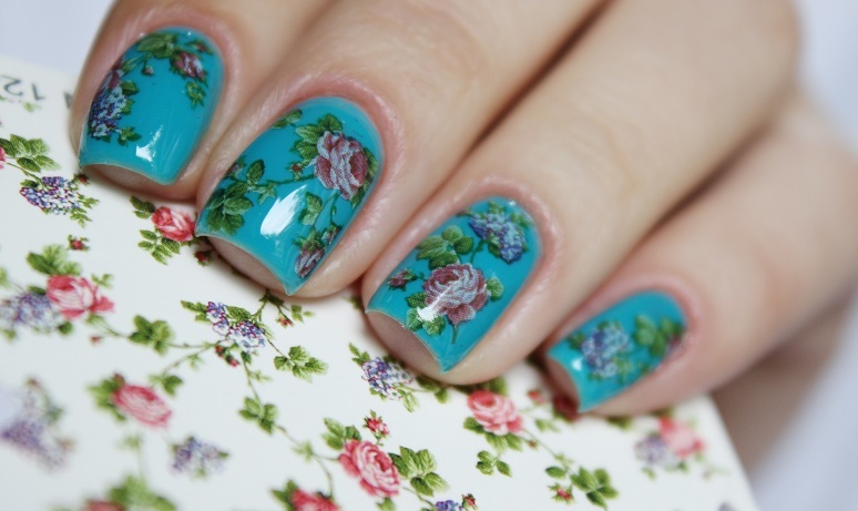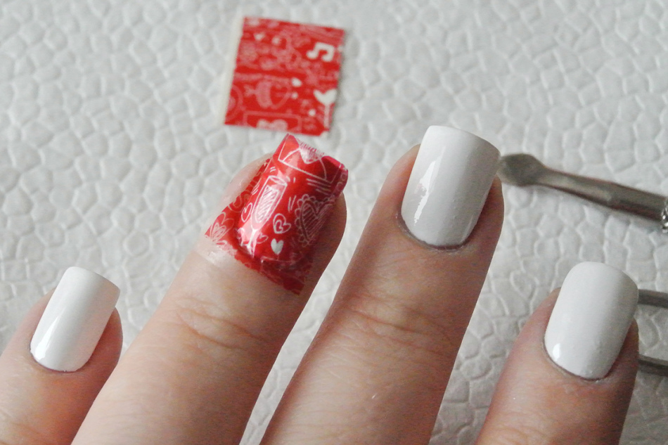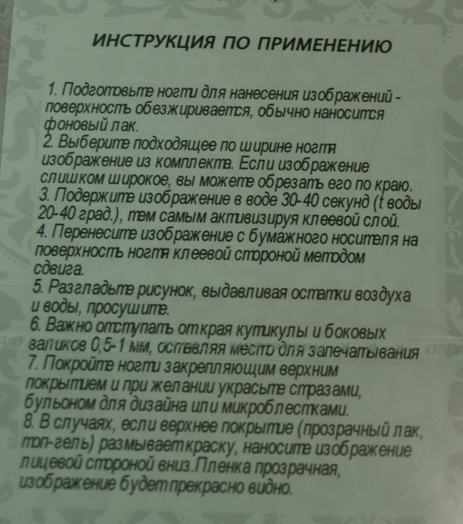 - Малюнок відокремлюється від підкладки і акуратно накладається на нігтьову пластину, розрівнюється на ній