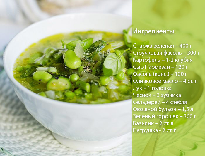 Супи в склад яких входить спаржа користуються великою популярністю в Італії, Франції, Англії та інших європейських країнах. Нижче представлений рецепт супу з італійської кухні.