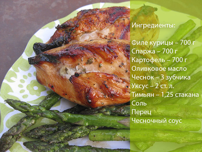 - Курка з часником, з смаженою картоплею і спаржею