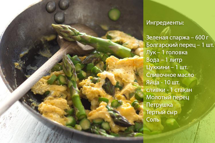 Омлет з смаженої спаржею в Італії називають фріттата. Це дуже популярний в цій країні блюдо готується дуже просто. Такий омлет на сніданок допоможе до обіду забути про почуття голоду.
