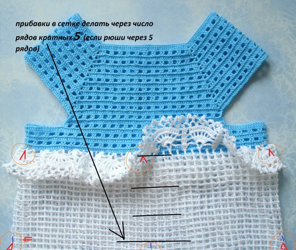 В наступному рядку після пройми додайте для пахв відсутню кількість петель (повітряних), щоб вийшов обхват грудей. В’яжіть сіткою, як і до цього, через однакові проміжки роблячи розширення.