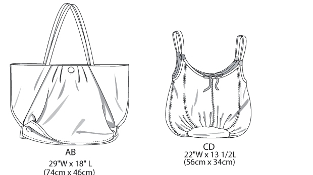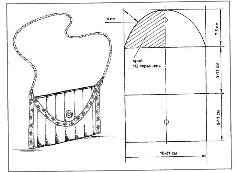 Ці моделі сумок легко зшити з клаптів різних тканин. Викрійка проста — два прямокутники для основної частини і довгі тонкі відрізи для ручки. По краях пришийте невеликі помпони або «пензлика» з ниток, або зробіть оригінальну вишивку з яскравих ниток.