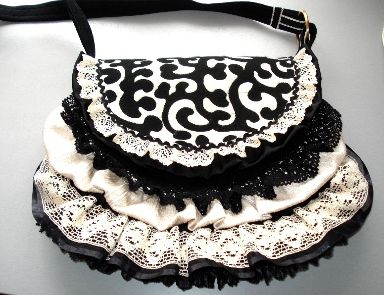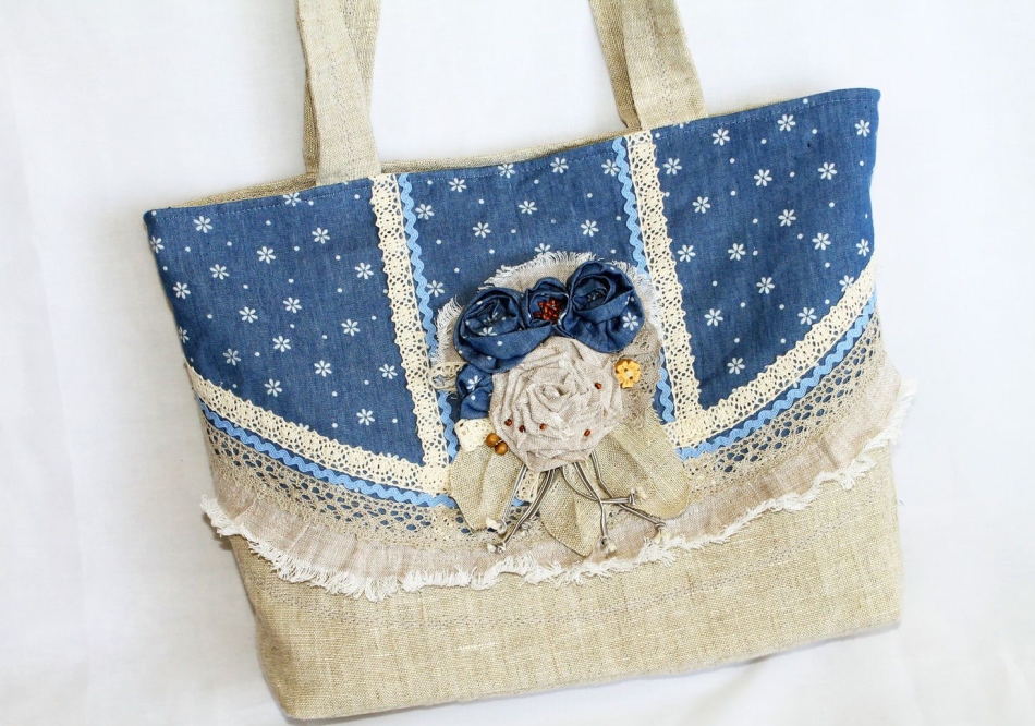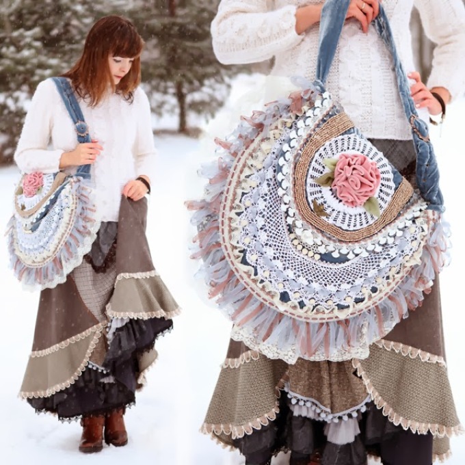 Старі мережива, тканина х/б с узором і однотонний матеріал в тон — сумка в стилі Бохо готова! Навіть матеріал чорного і білого кольору допоможе зробити неповторний шедевр на кожен день.