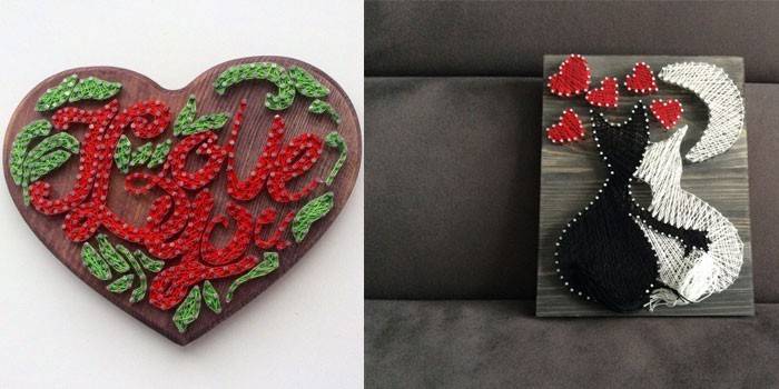 З допомогою стринг-арту можна змайструвати об’ємне зображення домашнього улюбленця: кішки, собаки, папуги. Любителі абстракції можуть освоїти техніку створення різнобарвного панно. Правильні геометричні форми ліній не стануть перешкодою для створення листівки до дня закоханих. Квіти, комах, тваринний світ, кухонне приладдя – все це можна легко втілити в картини з ниток і цвяхів.