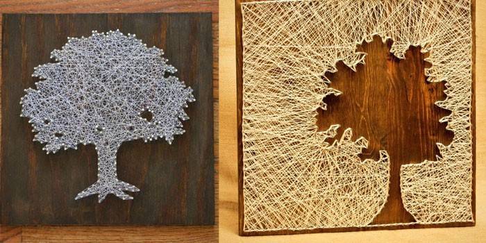 Дуже символічно на стіні буде виглядати дерево з ниток своїми руками. Впоратися з його створенням настільки ж просто, як і сплести з изонитей серце. Все, що вам для цієї картини знадобиться: шматочок гладкою фанери, молоток, крейду, зелена нитка і цвяхи з красивою капелюшком. Далі просто дотримуйтесь поетапної інструкції: