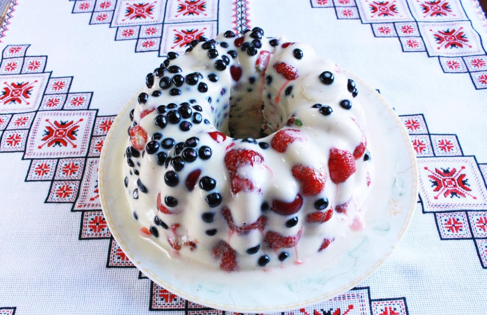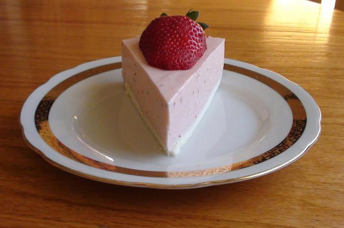 Готується торт з двох видів йогуртового желе: білого і полуничного (у співвідношенні 1 до 2 або 3). Спочатку у форму заливають перший шар, а коли він 15 хвилин застигне, другий. Прикрашають торт ягодами, мяткой.