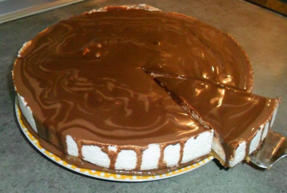 - Змішують сметану, вершки, сир і цукор, додають желатин на молоці. Добре вимішують масу міксером, після виливають на шоколадний шар