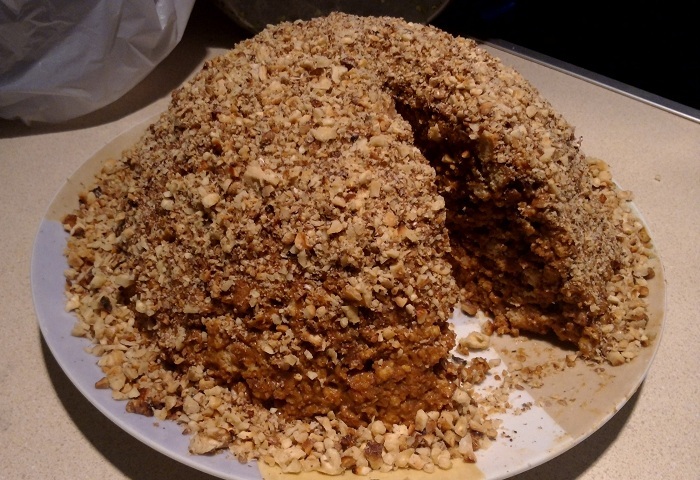 - Зверху промащують торт кремом, посипають подрібненими горіхами і тертим шоколадом