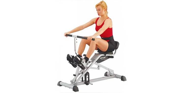 - Гребний тренажер. Недороге, компактне пристосування. З назви ясно, що вправи на нього нагадують греблю. Напружує всі групи м’язів, тому за годину середньої по інтенсивності тренування вдається спалити до 550 ккал. Починайте з коротких занять по 5 хвилин, поступово збільшуйте час. Гребні тренажери для схуднення живота і боків – відмінний варіант для бажаючих отримати гарне тіло.