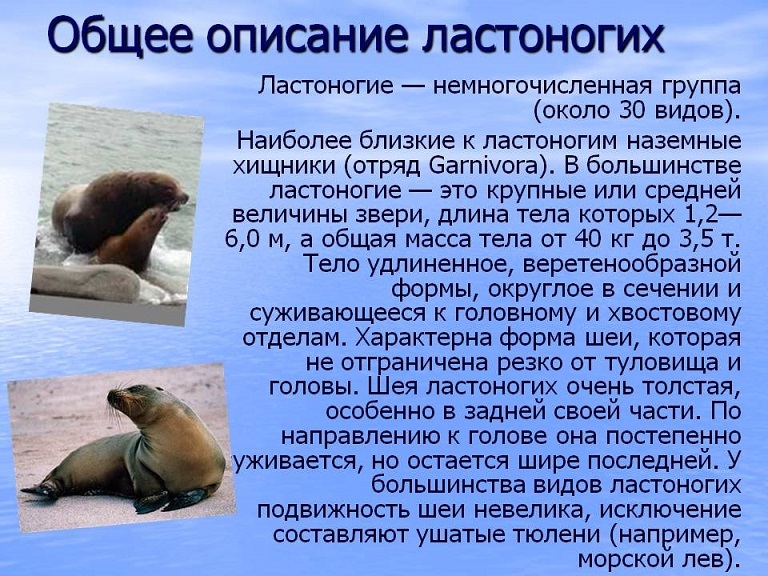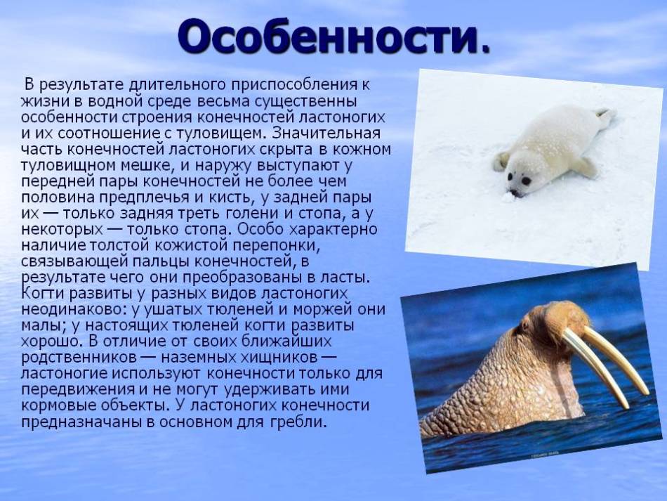 Всі ластоногі – це хижаки (їдять рибу, молюсків і навіть птахів), що живуть у воді, з веретеноподібним тілом, з кінцівки у вигляді плавців з пальцями, оснащеними кігтями і плавальними перетинками.