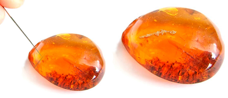 - Візьміть гострий предмет (голку, лезо) і проведіть лінію по поверхні каменю. Якщо камінь натуральний, то на ньому залишиться злегка помітний для ока слід. На склі ж ніяких дефектів не буде. Однак даний метод може пошкодити камінь.