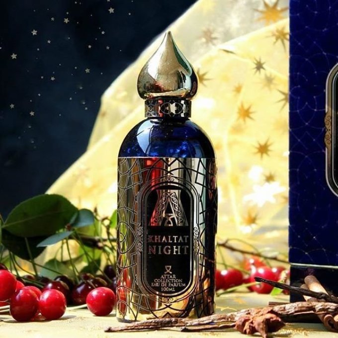 Khaltat Night. Маленький темно-синій флакончик Кхалтат Найт, усіяний золотими арабесками, ховає в собі справжній східний аромат, який навіває думки про падишахе і квітучих садах навколо його золотого палацу. Оригінальна композиція майстерно поєднує в себе весняний аромат квітучої дикої вишні, солодку пряність кориці і аромат зігрітого літнім сонцем яблука. Пачулі, білий мускус, ваніль доповнює рецепт цього смачного десерту.