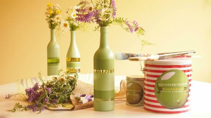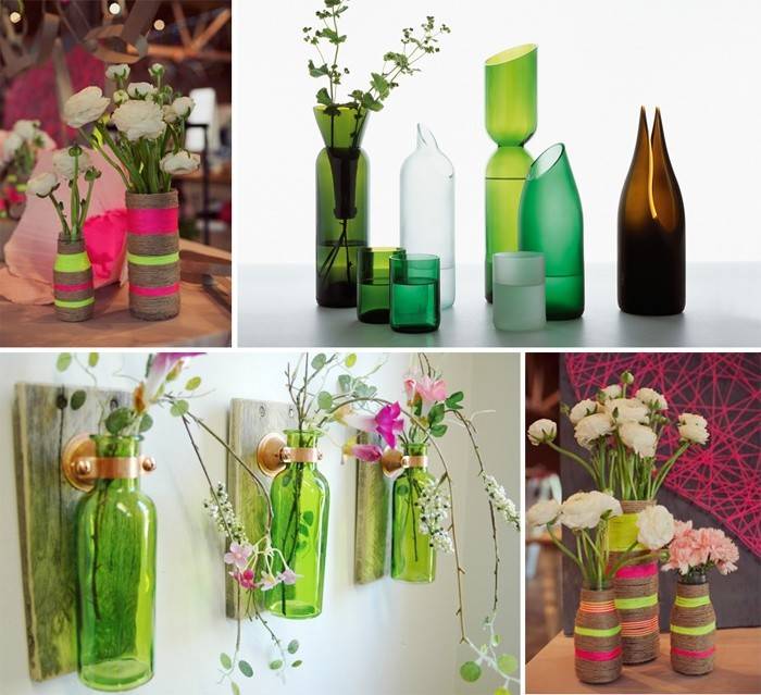 Рукоділля не обов’язково вимагає спеціальних інструментів і матеріалів – можна використовувати пляшку, що залишилася після якогось торжества. Для прикраси підійде все, що знайдеться у вас вдома – макарони, манка або сіль, яка піддається фарбуванню. Щоб зробити оригінальну вазу з пляшки своїми руками, подивіться відеоролики з майстер-класами по їх виготовленню.