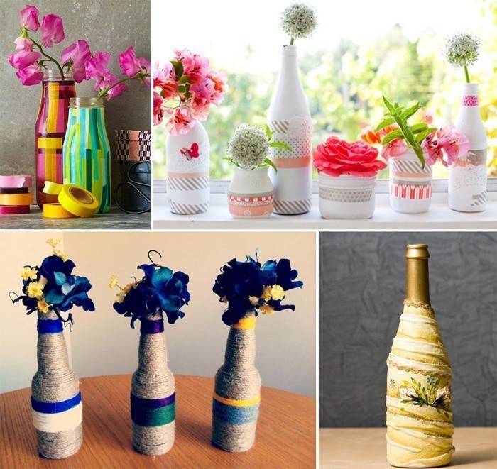 Крім перерахованих вище способів виготовлення і прикраси ваз ручної роботи є ще багато цікавих варіантів декору. Малюнок можна нанести за допомогою трафарету із звичайної ізоляційної стрічки, як показано на фотографії – вийде пляшка з хитромудрими смужками, як в одному напрямку, так і в різних. Для дітей хорошим тренуванням дрібної моторики будуть вази, оформлені підручними сипучими матеріалами або макаронами, камінчиками або черепашками. У випадках обмотування атласними стрічками дуже сміливо виглядає варіант з використанням замість них каната.