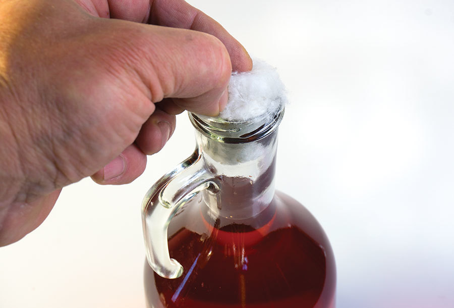 - Цей солодкий сироп з’єднайте з суслом в бутлі, на яку одягніть пробку з газовідвідною трубкою, кінець якої опущений у склянку з водою для контролю процесу виходу вуглекислоти