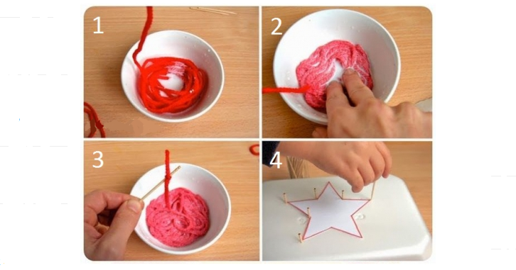 - Створіть за допомогою ниток, намочених візерунок всередині зірки. Не бійтеся фантазувати, в будь-якому випадку вийде красиво і цікаво.