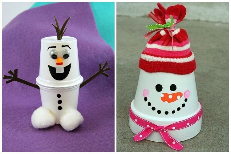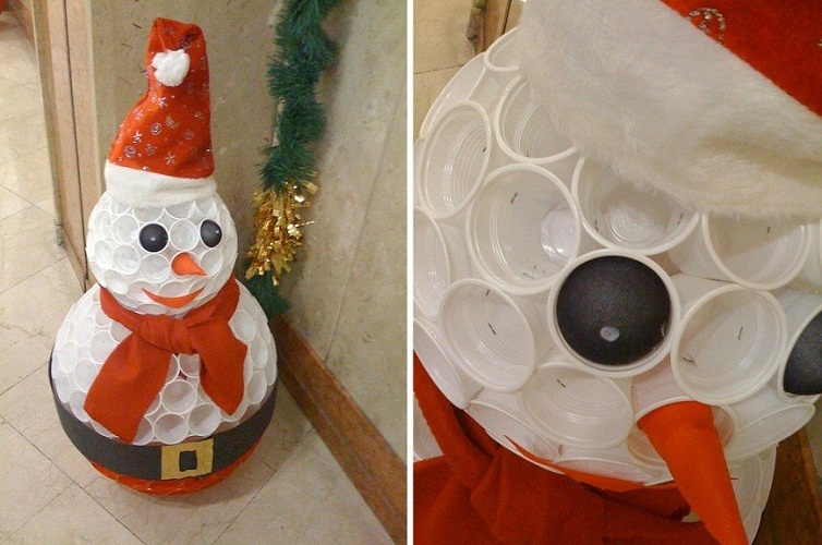 Новорічна виріб із пластикових стаканчиків у вигляді великого сніговика