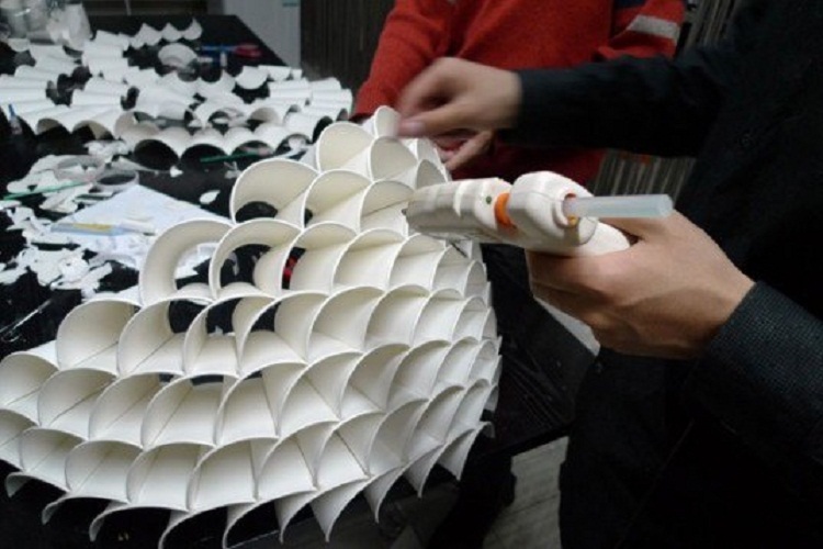 - Другий на черзі шар розкладаємо так само, як і перший. Накладаєте кожен стаканчик на попередній ярус, не в шаховому порядку. При цьому також потрібно посунути другий шар склянок на пару міліметрів всередину, щоб в кінці сформувати півкуля. Другий шар склянок також скріплюємо між собою разом, а ще скріплюємо кожен стакан верхнього ярусу з кожною одиницею нижнього ярусу.