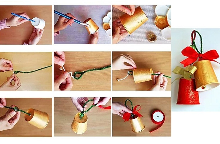- Берете 1 або 2 склянки, продеваете нитку в центральний отвір і прив’язуєте маленький дзвіночок. Якщо склянки дуже тонкі. Тоді краще одягніть їх один в один.