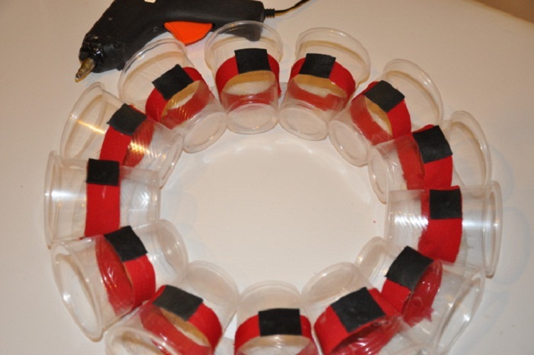 - До речі, можна поступити ще простіше – просто вставляти стакани один в одного, поки не утвориться коло. Досить прив’язати його за стрічку і прикрасити на свій розсуд.