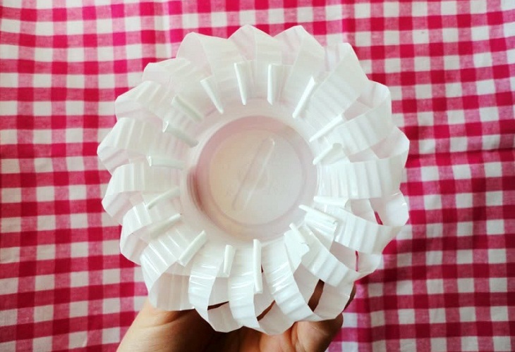 - Стаканчик потрібно розрізати ножицями до самого дна на рівні смужки, ширина яких становить приблизно 4-5 мм. При бажанні, можна трохи більше.
