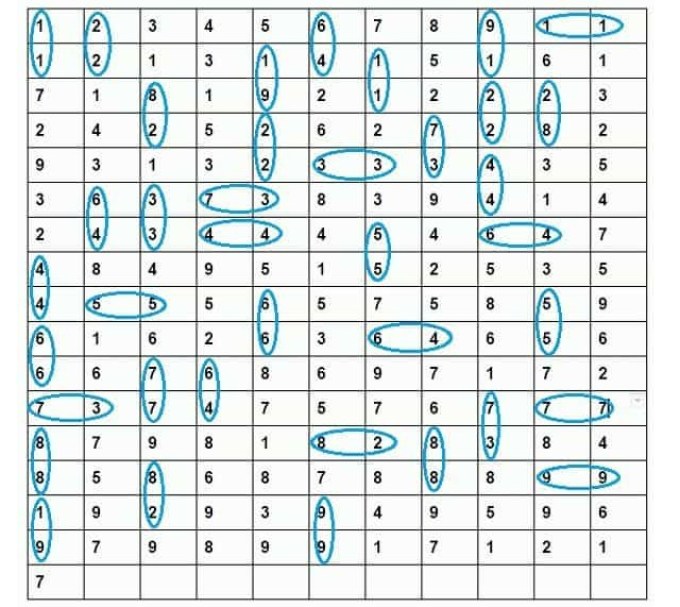 На листку напишіть цифри від 1 до 100 так, щоб в кінцевому підсумку вийшов квадрат. Ви можете розміщувати цифри по порядку або в хаотичному порядку, навіть не настільки важливо, скільки їх буде в рядку або стовпці. Головною умовою буде останнє число – воно має відповідати даті ворожіння. Далі приступаємо до викреслювання цифр. Ті, які при додаванні утворюють 10, прибираємо, також нам не потрібні повторювані числа. Коли ви закінчили, слід підрахувати залишилися числа.