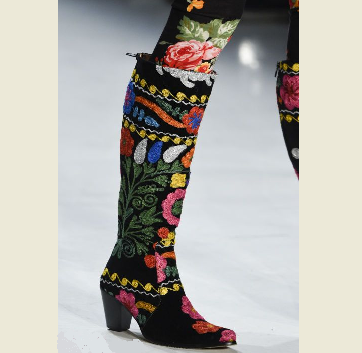 Гобелен з візерунком по всій довжині взуття можна зустріти не тільки восени на чоботях в цьому році. Такий декор чудово прикрашає лофери, босоніжки і навіть звичайні кімнатні капці.
