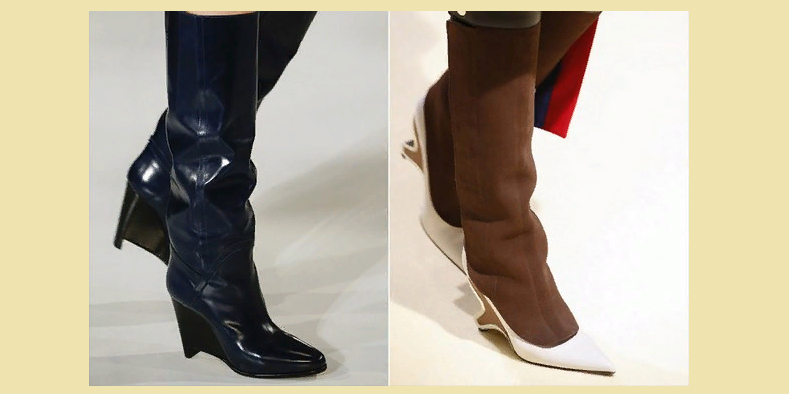 Дивний каблук і просторі халяви — все це модель чобіт, яка буде вас виділяти з натовпу. Моделі прикрашали подіуми в таких оригінальних, але дуже зручних і теплих чоботях. Адже взимку взуття повинна бути не тільки красивою, але і теплою.